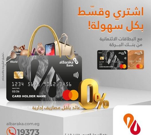 أعلن بنك البركة، أنه يمكن للعملاء شراء وتقسيط كافة احتياجاتهم بكل سهولة مع خدمة التقسيط على البطاقات الائتمانية بـ 0% عائد وبمصاريف إدارية تنافسية، وعلى فترات تقسيط تصل الى 3 سنوات. وتتيح خدمة التقسيط تتيح للعملاء تقسيط معاملات المشتريات او المعاملات عبر الإنترنت على بطاقة بنك البركة الائتمانية حيث يمكن تقسيط أي معاملة مشتريات من اي تاجر داخل او خارج مصر وذلك من خلال الاتصال بخدمة العملاء على الخط الساخن 19373. شروط وتفاصيل العرض _يجب على العميل الاتصال بمركز الاتصال 19373 لطلب التقسيط بعد تنفيذ العميل لعملية الشراء ببطاقته الائتمانية. _مدة التقسيط تبدأ من 3 أشهر حتى 36 شهر. _يجب ألا يقل مبلغ الشراء عن 500 جنيه مصري. _قيمة المصاريف الادارية لتقسيط المعاملة هي نسبة مئوية من المبلغ المطلوب تقسيطه. _سيتم خصم قيمة المصاريف الادارية من البطاقة لتصبح مديونية قائمة على البطاقة. _خدمة التقسيط متاحة على معاملات المشتريات فقط سواء كانت معاملة مشتريات عادية او من خلال الانترنت من البطاقات الائتمانية