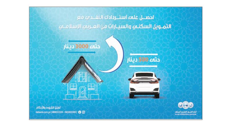 عمان في إطار سعي البنك العربي الإسلامي الدولي لتقديم الأفضل لعملائه، أعلن البنك عن استمرار حملة الاسترداد النقدي على تمويلات السيارات والشقق السكنية حتى 30/6/2024، بحيث يحصل العميل على مبلغ نقدي يتم إيداعه في حسابه مباشرة عند حصوله على أي من هذه التمويلات خلال فترة الحملة وضمن شروطها. وأوضح البنك بأن قيمة الاسترداد النقدي قد تم توزيعها على شرائح تعتمد على قيمة التمويل ونوعه، حيث أن قيمة الاسترداد النقدي لتمويل السيارات ستتراوح من 150 دينارا إلى 500 دينار على أن لا تقل قيمة التمويل عن 7000 دينار ومدة التمويل عن 5 سنوات، وان قيمة الاسترداد النقدي لتمويل الشقق السكنية ستتراوح من 1000 دينار وحتى 3000 دينار على أن لا تقل قيمة التمويل عن 20000 دينار ومدة التمويل عن 15 سنة. ولمزيد من المعلومات والاستفسار يمكن لكافة المهتمين مراجعة أي من فروع البنك المنتشرة في كافة محافظات المملكة، أو الاتصال على مركز الخدمة الهاتفية على الرقم 065003300 أو من خلال خدمة الواتساب «راسل» على الرقم 0797444669 تخضع لشروط وأحكام البنك.