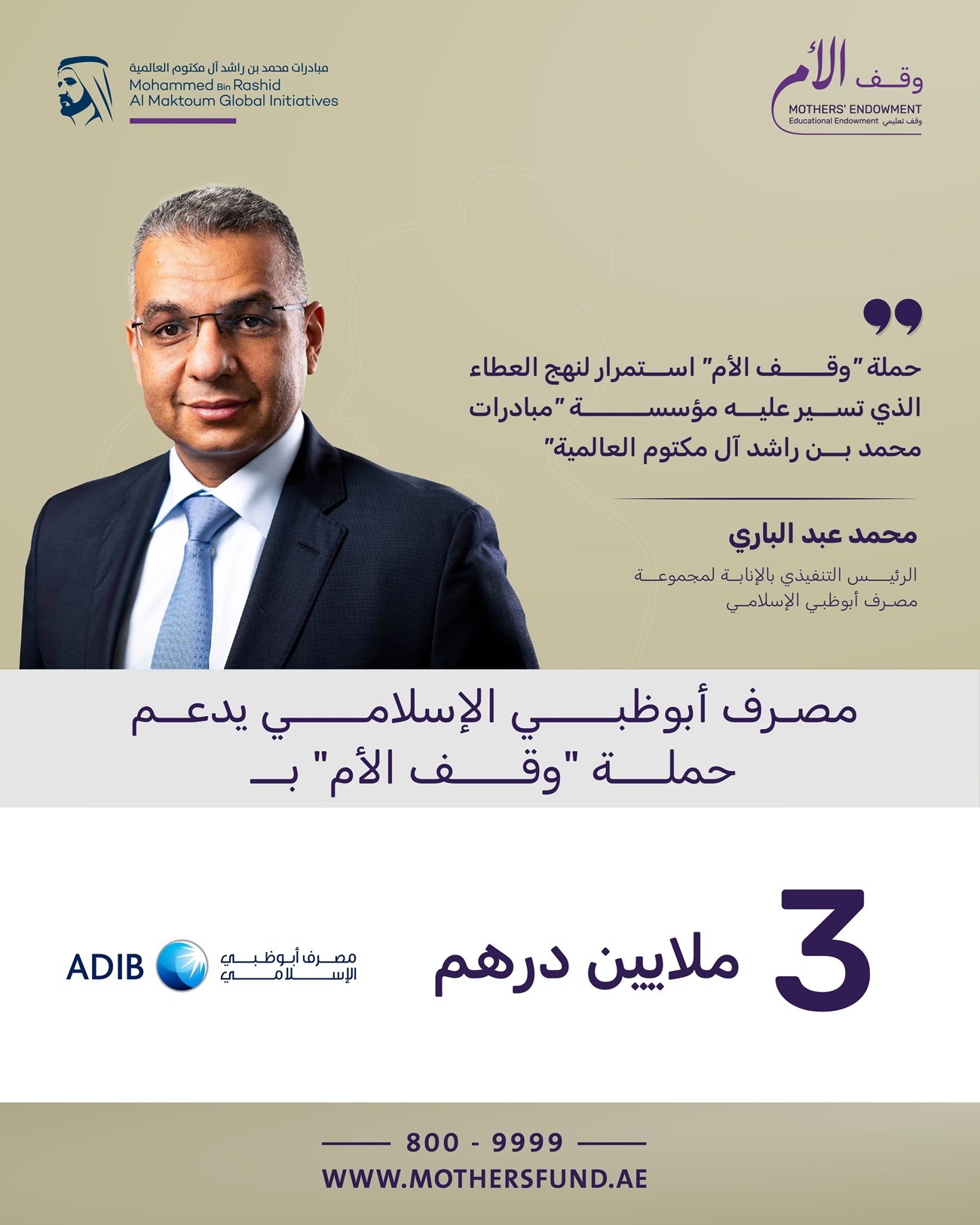 أعلن مصرف أبوظبي الإسلامي، مجموعة الخدمات المالية الإسلامية الرائدة، عن مساهمته بمبلغ 3 ملايين درهم لدعم حملة "وقف الأم" التي أطلقها صاحب السمو الشيخ محمد بن راشد آل مكتوم، نائب رئيس الدولة رئيس مجلس الوزراء حاكم دبي "رعاه الله"، لتكريم الأمهات بإنشاء صندوق وقفي بقيمة مليار درهم لدعم تعليم ملايين الأفراد حول العالم بشكل مستدام. وتستخدم عائدات حملة "وقف الأم" التي تندرج تحت مظلة مؤسسة "مبادرات محمد بن راشد آل مكتوم العلمية"، في تنفيذ مشاريع تعليمية في المجتمعات الأقل حظاً، كما تمنح هذه البرامج ملايين الأفراد حول العالم الأدوات والمهارات اللازمة لتكوين حياة مستقلة تصون كرامتهم وتضمن لهم العيش الكريم، وذلك بالشراكة مع عدد من المنظمات والمؤسسات الإنسانية. وتسعى الحملة إلى ترسيخ قيم بر الوالدين والمودة والتراحم والتكافل بين أفراد المجتمع، وتعزيز موقع الإمارات في مجال العمل الخيري والإنساني، من خلال إنجاز وقف مستدام يضمن توفير فرص للتعليم والتمكين. محطة نوعية وقال محمد عبدالباري، الرئيس التنفيذي بالإنابة لمجموعة مصرف أبوظبي الإسلامي: تمثل حملة "وقف الأم"، محطة نوعية في المبادرات الخيرية والإنسانية لدولة الإمارات، واستمراراً لنهج العطاء الذي تسير عليه مؤسسة مبادرات محمد بن راشد آل مكتوم العالمية، حيث أسهم في تغيير حياة عشرات ملايين البشر في العالم، وقدم للفئات الضعيفة والمحرومة المقومات الكافية لتحسين حياتها، وقد أولت مؤسسة المبادرات منذ إطلاقها اهتماماً كبيراً بقضية التعليم، وهو ما تستكمله اليوم بالمبادرة الملهمة "وقف الأم". وأضاف: مشاركتنا في دعم هذه الحملة الرمضانية، تعبر عن قناعة راسخة في مصرف أبوظبي الإسلامي، بأهمية المساهمة في إنجاح حملات الخير التي تنطلق من دولة الإمارات خلال الشهر الفضيل، وتستهدف مساعدة المجتمعات الأقل حظاً، وليس هناك من دعم أكبر لهذه المجتمعات من تعليم أبنائها، وتزويدهم بالمعارف والأدوات بما يضمن في تغيير واقعهم نحو الأفضل. 6 قنوات للمساهمة وتواصل حملة "وقف الأم" استقبال المساهمات في الصندوق الوقفي من المؤسسات والأفراد عبر 6 قنوات رئيسية هي الموقع الإلكتروني المخصص للحملة Mothersfund.ae، فيما يستقبل مركز الاتصال الخاص بالحملة مشاركات المساهمين في الوقف عبر رقم الاتصال المجاني 8009999، ويمكن أيضاً المشاركة في الحملة عن طريق التحويل المصرفي لحساب الحملة على رقم الحساب المعتمد AE790340003708472909201 في مصرف الإمارات الإسلامي بالدرهم الإماراتي، كما توفر حملة "وقف الأم" خيار التبرع عبر الرسائل النصية للمبادرة بإرسال رسالة بكلمة " أمي" أو "Mother" لمستخدمي شبكتي"دو" و" اتصالات من e&" في الإمارات على الأرقام التالية: 1034، 1035، 1036، 1038، ويمكن المساهمة في الحملة عبر تطبيق "دبي الآن" DubaiNow، تحت فئة "التبرعات"، أو عبر منصة دبي للمساهمات المجتمعية "جـود" (Jood.ae). مصرف أبوظبي الإسلامي وبالإضافة إلى مساهمته الكبيرة في حملة وقف الأم، يواصل مصرف أبوظبي الإسلامي التزامه بتنمية المجتمع وتمكينه، ويسعى إلى أن يكون مساهما فعالاً في التنمية المستدامة في دولة الإمارات العربية المتحدة وعلى مستوى العالم. ويحدد المصرف بانتظام عدداً من البرامج والمبادرات الاستباقية والمسؤولة التي سيتم تنفيذها على مستوى الشركات وضمن المشاريع الاستثمارية، وتهدف هذه المبادرات إلى معالجة مختلف التحديات الاجتماعية والاقتصادية والبيئية التي تواجهها المجتمعات، مع التوافق مع القيم والمبادئ الأساسية للمصرف.