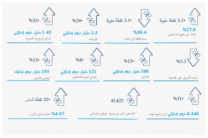 أعلن مصرف أبوظبي الإسلامي تحقيق نمو في صافي أرباحه بنسبة 32% بعد الضريبة في الربع الأول من عام 2024، لتبلغ قيمتها 1.45 مليار درهم، مقارنة مع 1.1 مليار درهم خلال الربع الأول لعام 2023. وتعكس هذه النتائج توجه المصرف الراسخ لتحقيق النمو القوي. وبلغ صافي الأرباح قبل الضريبة 1.64 مليار درهم، وهو ما يمثل نمواً بنسبة 41% مقارنة بالربع الأول من عام 2023. وسجلت إيرادات «أبوظبي الإسلامي» في الربع الأول من عام 2024 نمواً بنسبة 24% لتبلغ 2.5 مليار درهم مقابل ملياري درهم في العام السابق، وذلك بفضل النمو المحقق في جميع شرائح الأعمال والمنتجات. وسجل الدخل من مصادر التمويل نمواً بواقع 19% ليبلغ 1.7 مليار درهم مقارنة مع 1.4 مليار درهم في العام الماضي، مدفوعاً بارتفاع أحجام الدخل وتحسن الهوامش. وسجل الدخل من غير مصادر التمويل نمواً بواقع 35% في الربع الأول من عام 2024 ليبلغ 827 مليون درهم إماراتي مقارنة مع 611 مليون درهم إماراتي في العام السابق، مدفوعاً بنمو الرسوم والعمولات بنسبة 40%. ويسهم الدخل من غير مصادر التمويل بنسبة 33% من الدخل التشغيلي مقابل 30% في الربع الأول من عام 2023. وانخفضت نسبة التكلفة إلى الدخل لتصل إلى معدل 30.4%، محققة تحسناً بمقدار 5.3 نقاط مئوية بالمقارنة مع 35.7% في العام السابق، ما يُعزى بشكل رئيس إلى نمو الدخل وتحسن الإنتاجية. وانخفضت مخصصات خسائر التمويل والاستثمار بنسبة 25% لتصل إلى 109 ملايين درهم في الربع الأول عام 2024. وتزامن هذا النمو مع تحسن نسبة الأصول غير المنتجة لتصل إلى 5.5%، وهو أدنى معدل منذ الربع الرابع من عام 2019، ويعود ذلك للإدارة الفعالة للمحفظة ومعايير الاكتتاب القوية، بينما حققت نسبة التغطية (بما فيها الضمانات) تحسناً بواقع 16.0 نقطة مئوية لتبلغ 144.7%. كما ارتفع إجمالي الأصول بنسبة 13% ليصل إلى 195 مليار درهم، نتيجة نمو إجمالي التمويل بواقع 8% على أساس سنوي، وزيادة الاستثمارات بنسبة 25%. وسجلت ودائع المتعاملين نمواً بنسبة 13% لتبلغ 160 مليار درهم بالمقارنة مع 142 مليار درهم إماراتي في الربع الأول من عام 2023، مدفوعة بنمو ودائع الحسابات الجارية وحسابات التوفير بنسبة 9%، علماً أن الحسابات الجارية وحسابات التوفير تشكل حالياً نسبة 66% من إجمالي الودائع. وحافظ مصرف أبوظبي الإسلامي على مركز راسخ لرأس المال، حيث بلغ معدل كفاية الشق الأول من حقوق المساهمين 12.6%، ونسبة كفاية إجمالي رأس المال 17.2%، كما استقرت السيولة النقدية للمصرف عند مستويات سليمة تتماشى مع المتطلبات التنظيمية، مع تسجيل تحسن في نسبة مصادر التمويل المستقرة بلغ 76.6%، ونمو الأصول السائلة المؤهلة بنسبة 20.3%.