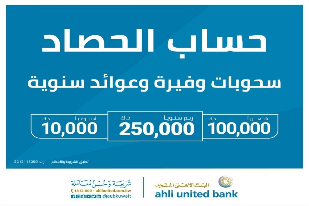 أعلن البنك الأهلي المتحد نتيجة السحب الأسبوعي على جوائز الحصاد، والذي أقيم يوم 10 الجاري في المقر الرئيسي للبنك، بحضور ممثل عن وزارة التجارة والصناعة، بالإضافة إلى حضور وإشراف ممثل من شركة ديلويت العالمية المدقق الخارجي لمراجعة عملية السحب، التزاماً بتعليمات وزارة التجارة والصناعة في ذلك الشأن. وأسفر السحب عن حصول 10 من العملاء على 1,000 دينار لكل منهم وهم: روزي جوزيف دي سوزا، وعبدالرزاق محمد جعفر آل رشيد، وعادل اسماعيل أحمد الذويب، عبدالرؤوف راضي عيسى بوموزة، وبدرية ناصر سلمان الرشدان، وخلود مطلق حشف المطيري، ومريم محمد صهيب كمبال، وبدرية مفلح حمود الصويلح، وأديبة عبد الله محمد حبيب، وأحمد حسين أشكناني. اقرأ المزيد: https://www.aljarida.com/article/50604
