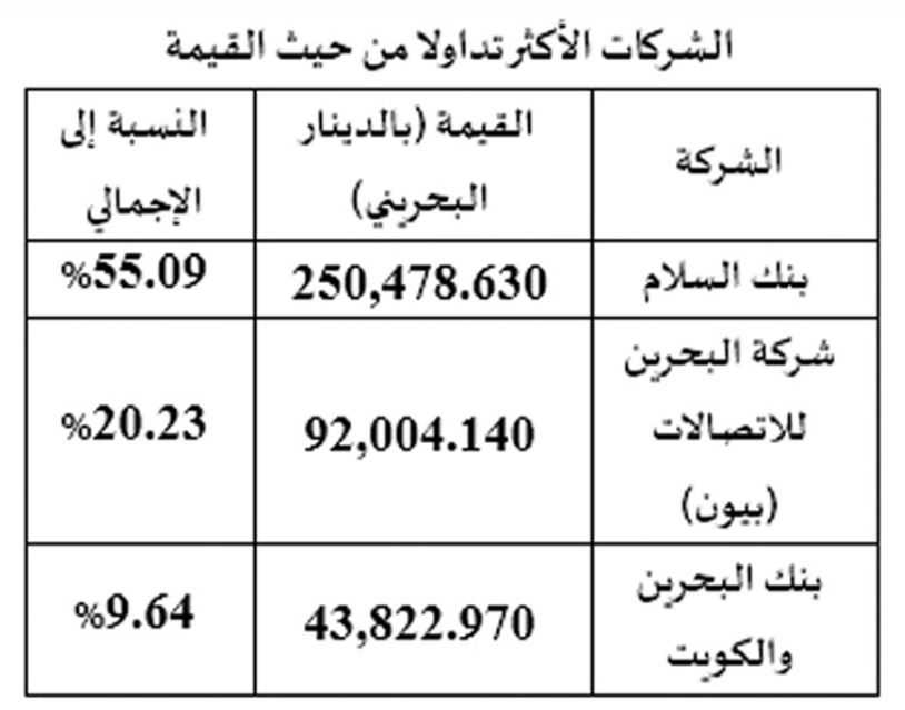 الاثنين ٠٩ أكتوبر ٢٠٢٣ - 02:00 أقفل «مؤشر البحرين العام» يوم أمس الأحد عند مستوى 1,949.12 نقطة بانخفاض قدره 1.75نقطة مقارنة بإقفاله يوم الخميس الماضي، في حين أقفل «مؤشر البحرين الإسلامي» عند مستوى 735.60 نقطة بانخفاض قدره 2.24 نقطة مقارنة بإقفاله السابق. وقد تداول المستثمرون في «بورصة البحرين» 1.79 مليون سهم، بقيمة إجمالية قدرها 454.70 ألف دينار بحريني، تم تنفيذها من خلال 55 صفقة، حيث ركز المستثمرون تعاملاتهم على أسهم قطاع المال والتي بلغت قيمة أسهمه المتداولة 322.01 ألف دينار أي ما نسبته 70.82% من القيمة الإجمالية للتداول وبكمية قدرها 1.52 مليون سهم ، تم تنفيذها من خلال 37 صفقة. جاء بنك السلام في المركز الأول إذ بلغت قيمة أسهمه المتداولة 250.48 ألف دينار أي ما نسبته 55.09% من إجمالي قيمة الأسهم المتداولة وبكمية قدرها 1.38 مليون سهم ، تم تنفيذها من خلال 30 صفقة. أما المركز الثاني فكان لشركة البحرين للاتصالات (بيون) بقيمة قدرها 92 ألف دينار أي ما نسبته 20.23% من إجمالي قيمة الأسهم المتداولة وبكمية قدرها 187.71 ألف سهم، تم تنفيذها من خلال 12 صفقة. ثم جاء بنك البحرين والكويت بقيمة قدرها 43.82 ألف دينار أي ما نسبته 9.64% من إجمالي قيمة الأسهم المتداولة وبكمية قدرها 87.47 ألف سهم، تم تنفيذها من خلال 5 صفقات. وقد تم يوم أمس تداول أسهم 11 شركة، انخفضت أسعار أسهم 3 شركات، في حين حافظت بقية الشركات على أسعار إقفالاتها السابقة.