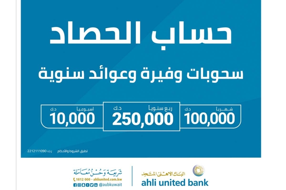 أعلن البنك الأهلي المتحد نتيجة السحب الشهري لبرنامج جوائز الحصاد الإسلامي، الذي أجري اليوم الأربعاء، في المقر الرئيسي للبنك، بحضور ممثل عن وزارة التجارة والصناعة، وحضور وإشراف ممثل من شركة «ديلويت» العالمية المدقق الخارجي لمراجعة عملية السحب، التزاماً بتعليمات الوزارة بهذا الشأن، وحصلت على الجائزة وقيمتها 100 ألف د.ك العميلة بهية شجاع ناصر. وبهذه المناسبة، قدم رئيس التسويق وتطوير المنتجات في إدارة الخدمات المصرفية للأفراد بالبنك الأهلي المتحد أمريش ناندكيول يار التهنئة للفائزة، متمنياً لها دوام التوفيق، وأعرب عن أمله أن يحالف التوفيق جميع عملاء البنك في السحوبات المقبلة، معرباً في الوقت ذاته عن سعادته البالغة بالثقة الغالية التي يضعها العملاء في البنك. وأكد ناندكيول يار، حرص «المتحد» منذ إطلاق برنامج جوائز الحصاد الإسلامي على تقديم باقة حصرية من الجوائز، بما يسهم في تحقيق تطلعات عملائه، ويعمل على تعزيز ثقافة الادخار، وشددت على التزام البنك بتوفير الحلول المصرفية الحديثة، التي تنسجم مع متطلبات العملاء المختلفة. ويقدم حساب الحصاد الإسلامي في باقته الحالية مجموعة أوسع من المزايا، إذ يحظى الرابحون من عملاء المتحد بجائزة شهرية بقيمة 100,000 د.ك. إضافة إلى 10 جوائز أسبوعية بقيمة 1,000 د.ك لكل جائزة، وتبقى الجوائز ربع السنوية الكبرى بقيمة 250,000 د.ك نقداً للرابح أهم ما يطمح إليه العملاء، إذ تمثل لهم فرصة حقيقية لتحقيق حلم العمر. وعلاوة على هذه الباقة من الجوائز الجذابة، هناك أيضاً أرباح سنوية متوقعة على أساس عقد الوكالة، وهو ما يزيد من جاذبية حساب الحصاد الإسلامي. وينفرد حساب الحصاد بالعديد من المميزات، منها أنه أبسط وأسهل برنامج إدخار، فضلاً عن ميزة فتح الحساب عبر الإنترنت بكل سهولة ويسر مع ميزة الإيداع الفوري في الحساب.