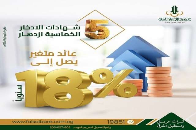 أعلن بنك فيصل الإسلامي المصري عن رفع العائد على شهادات الادخار الخماسية “ازدهار” ليصل إلى 18% سنوياً يُصرف شهرياً تحت التسوية ويحتسب بناءً على نتائج الأعمال الفعلية للبنك وفقاً لأحكام الشريعة الإسلامية. مزايا شهادات الادخار الخماسية «ازدهار» من بنك فيصل: – الشهادة اسمية ومدتها خمس سنوات تبدأ من اليوم التالى لتاريخ الشراء, وتخضع لأحكام الشريعة الإسلامية. – العائد شهرى متغير يصرف تحت التسوية خلال الأسبوع الأول من الشهر التالي للشراء لحين ظهور نتائج الأعمال الفعلية نهاية كل ربع سنة وتسويتها بحساب العميل. – الشراء من جميع فروع البنك للأفراد الطبيعين (مصريين أو أجانب) والأشخاص المعنوية، ويجوز الشراء بأسماء القصر (بالولاية / بالوصاية). – يجوز استرداد قيمة الشهادة قبل تاريخ الاستحقاق بعد مرور ستة أشهر على الأقل من تاريخ الشراء وفقاً للقواعد المنظمة للاسترداد بالبنك. – تجدد الشهادات لمدد أخرى تلقائياً فى تاريخ الاستحقاق وعند طلب العميل عدم التجديد تضاف قيمة الشهادات لحساب العميل. – لأصحاب الشهادات فرصة لأداء العمرة من خلال السحب الذى يجريه البنك مرتين فى العام لعدد 50 عميلاً من عملاء البنك بشرط مرور ستة أشهر من تاريخ إصدار الشهادة وبحيث لا تقل قيمة الشهادات عن 5000 جنيه.