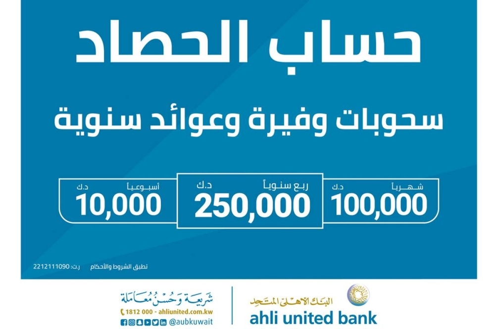 أعلن البنك الأهلي المتحد نتيجة السحب الأسبوعي على جوائز الحصاد، والذي أقيم أمس في المقر الرئيسي للبنك، بحضور ممثل عن وزارة التجارة والصناعة، وأسفر السحب عن حصول 10 من العملاء على 1.000 دينار لكل منهم، وهم: عائشة محمد إسماعيل البحري، وكارونا تانجام إيدوين، وخالد عبدالله عيد العتيبى، وسعد لهمان حسن الدوسري، وحسين علي حسن المطوع، وخليل إبراهيم آبل أشكناني، وعامر بدر سعود العازمي، ولولوة محمد فهيد العتيبي، وهيام جواد محمود جوهر حياة، وأمينة داود بلال فيروز. ويقدم «الحصاد الإسلامي» في باقته الحالية مجموعة أوسع من المزايا، حيث يحظى الرابحون من عملاء «المتحد» بجائزة شهرية بقيمة 100.000 د.ك. بالإضافة إلى 10 جوائز أسبوعية بقيمة 1.000 دينار لكل جائزة. وتبقى الجوائز ربع السنوية الكبري بقيمة 250.000 د.ك. نقداً للرابح هي أهم ما يطمح إليه العملاء، حيث تمثل لهم فرصة حقيقية لتحقيق حلم العمر، وفضلا عن هذه الباقة من الجوائز الجذابة، هناك أيضاً أرباح سنوية متوقعة على أساس عقد الوكالة، وهو ما يزيد من جاذبية حساب الحصاد الإسلامي.