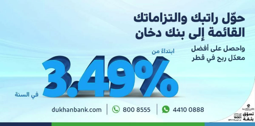 أطلق بنك دخان حملته الجديدة للتمويل الشخصي، بأفضل معدّل ربح في قطر ابتداءً من 3.49% سنويًا، وذلك ضمن مساعيه الحثيثة لتقديم حلول تمويلية مميّزة لعملائه الجدد، تمكنهم من تحقيق تطلعاتهم المالية المُختلفة. تتضمن الحملة، التي تمتد حتى 31 ديسمبر 2025، تقديم تمويل شخصي للعملاء الذين يقومون بتحويل رواتبهم والتزاماتهم المالية القائمة إلى بنك دخان، ما يمنحهم أفضل معدّل ربح في قطر. وفقًا لشروط الحملة، سوف يحصل العملاء الذين يبلغ دخلهم الشهري 35,000 ريال قطري فأكثر على أفضل معدل ربح وهو 3.49%، بينما يستفيد أصحاب الدخل الشهري من 20,000 ريال قطري حتى 34,999 ريال قطري من معدل ربح يبلغ 3.80%، أما من يتراوح دخلهم الشهري بين 10,000 ريال قطري و19,999 ريال قطري، فسوف يحصلون على معدل ربح قدره 4.00%. علاوة على ذلك، تشمل مزايا هذه الحملة فترة سماح تصل إلى 3 أشهر قبل الشروع في دفع الأقساط، على أن تكون مدة التمويل الأدنى 4 سنوات. ويُضاف إلى ذلك إجراءات ميسّرة وموافقات سريعة تضمن سهولة حصول العملاء على التمويل في أقرب وقت ممكن ودون متاعب. كما يحصل العملاء على بطاقة ائتمانية مجانية للسنة الأولى، والاستفادة من عام كامل من المزايا والمكافآت الخاصة بالبطاقة. وبهذه المناسبة، قال السيّد طلال أحمد الخاجة، الرئيس التنفيذي للتسويق والاتصال في بنك دخان: «يسعدنا إطلاق هذه الحملة الاستثنائية للتمويل الشخصي، والتي تقدم أفضل معدّل ربح في قطر وتوفّر لعملائنا الجدد حلًا تمويليًا يمنحهم مزايا كبيرة ويلبّي احتياجاتهم المتطوّرة. تعكس هذه الحملة التزام بنك دخان المُستمر بدفع عجلة الابتكار في التمويل الشخصي وتقديم قيمة حقيقية لعملائه. ومن خلال هذه المبادرة، نسعى إلى تعزيز مكانتنا في السوق، وزيادة رضا العملاء، ودعم تطلعاتهم المالية من خلال حلول تتماشى مع احتياجاتهم وطموحاتهم».