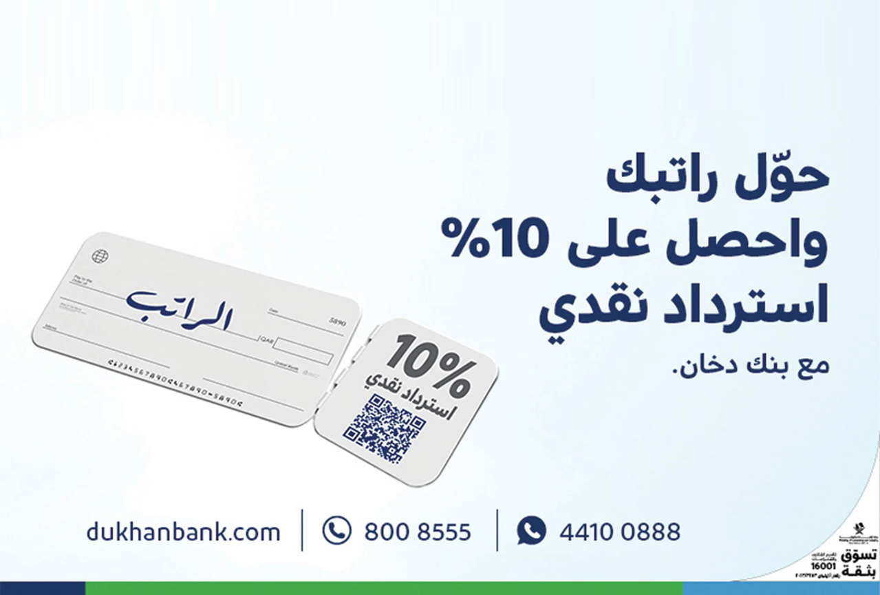 كشفَ بنكُ دخان عن حملة ترويجيَّة جديدة تتيح للعملاء الجدد الحصولَ على استرداد نقدي بقيمة 10% من الراتب عند تحويله إلى حساباتِهم بالبنك. على امتداد الحملة، سيحصلُ العملاء، عند تحويل راتب شهري بقيمة 10,000 ريال قطري على الأقل إلى حسابهم الجاري بالبنك، على 10% استردادًا نقديًا من إجمالي الراتب الأول، بحيث لا يتجاوز الحد الأقصى للاسترداد النقدي 10,000 ريال قطري. وستُضاف مكافأة الاسترداد النقدي إلى رصيد البطاقة البنكية مسبقة الدفع أو البطاقة الائتمانية الخاصة بالعميل والصادرة من بنك دخان. تسري الحملة حتى 31 أغسطس 2023 ضمن مبادرات بنك دخان لتوسيع قاعدة عملائه المصرفية من خلال زيادة القيمة المضافة التي يقدمها لهم. وتعليقًا على الحملة، صرّح السيّد طلال أحمد الخاجة، الرئيس التنفيذي للاتصال في بنك دخان: «سعداء للغاية بإطلاق هذه الحملة الترويجية على تحويل الرواتب، والتي تأتي كجزء من جهودنا المستمرة لمكافأة عملائنا الكرام لاختيارهم بنك دخان شريكًا مصرفيًا مفضلًا. تبرهن هذه الحملة على التزامنا الدائم بتقديم حلول مبتكرة ذات قيمة متميّزة ترقى إلى مستوى تطلعات عملائنا من ناحية، وتمكّنهم من الاستفادة من مزايا عديدة في مختلف تعاملاتهم اليومية من ناحية أخرى عبر محفظة تزخر بالمنتجات والخدمات المتطورة التي يشتهر بها البنك». ويقدِّمُ بنك دخان مجموعة متكاملة من الخدمات المصرفية المتوافقة مع أحكام الشريعة التي تتضمن الخدمات المصرفية للأفراد، خدمات الشركات، الخدمات المصرفية التجارية وللأعمال، الخدمات المصرفية الخاصة، التمويل العقاري، التمويل المنظم، الاستثمارات وإدارة الأصول.