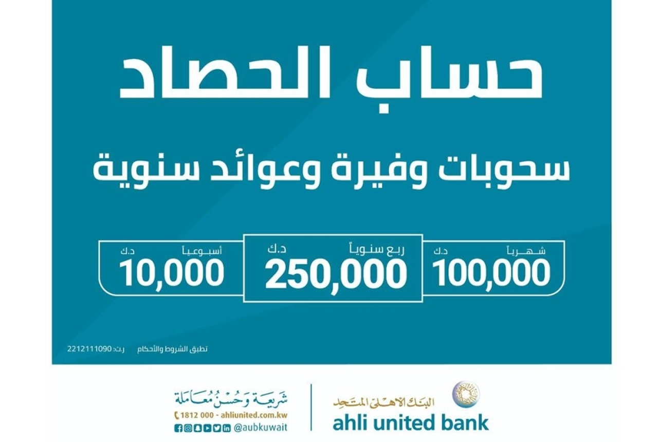 أعلن البنك الأهلي المتحد نتيجة السحب الشهري على جوائز الحصاد، الذي أقيم يوم 3 الجاري في المقر الرئيسي للبنك، بحضور ممثل عن وزارة التجارة والصناعة. وحصلت على الجائزة، وقيمتها 100 آلف د. ك، العميلة آمال جاسم الزلزلة ويقدّم حساب الحصاد الإسلامي، في باقته الحالية، مجموعة أوسع من المزايا، حيث يحظى الرابحون من عملاء «المتحد» بجائزة شهرية بـ 100 ألف د. ك، إضافة إلى 10 جوائز أسبوعية بـ 1000 دينار لكل جائزة. وتبقى الجوائز ربع السنوية الكبري بـ 250 ألف د. ك، نقداً للرابح هي أهم ما يطمح إليه العملاء، حيث تمثّل لهم فرصة حقيقية لتحقيق حلم العمر، وفضلاً عن هذه الباقة من الجوائز الجذابة، هناك أيضاً أرباح سنوية متوقعة على أساس عقد الوكالة، وهو ما يزيد من جاذبية حساب الحصاد الإسلامي.