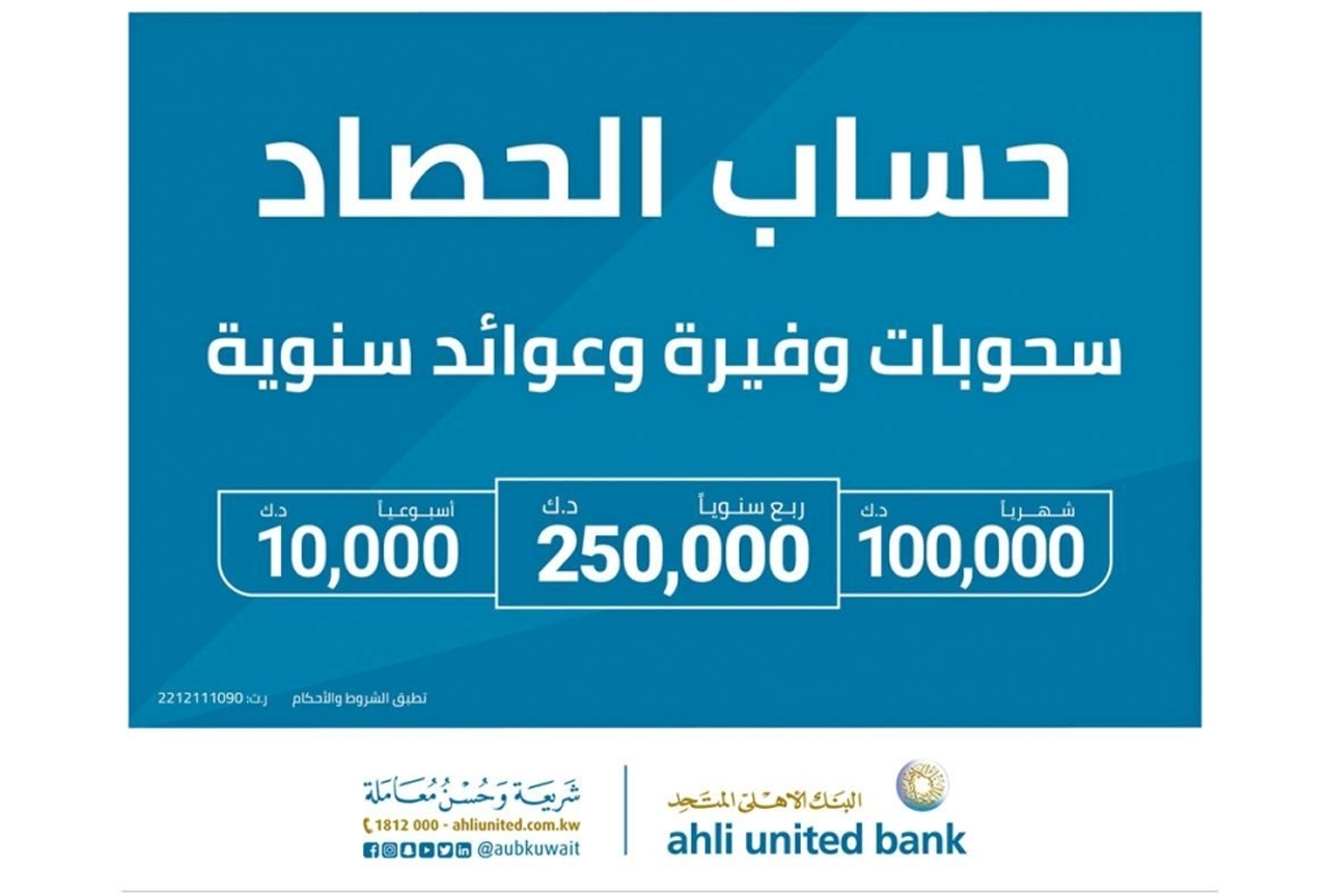 أعلن البنك الأهلي المتحد عن فوز صديقة علي ناصر القطان بـ 250 ألف دينار، في السحب ربع السنوي من برنامج جوائز الحصاد الإسلامي، الذي أقيم أمس بالمقر الرئيسي للبنك، بحضور ممثل عن وزارة التجارة والصناعة. وبهذه المناسبة، قدمت رئيسة إدارة قنوات التوزيع البديلة بالبنك، هنادي خزعل، التهنئة للفائزة، متمنية لها دوام التوفيق، وأعربت عن أملها بأن يحالف التوفيق جميع عملاء البنك في السحوبات القادمة، معربة - في الوقت ذاته - عن سعادتها البالغة بالثقة الغالية التي يضعها العملاء في البنك. وأكدت خزعل أن البنك حرص منذ إطلاق برنامج جوائز الحصاد الإسلامي على تقديم باقة حصرية من الجوائز، بما يسهم في تحقيق تطلّعات عملائه، ويعمل على تعزيز ثقافة الادخار، وشددت على التزام البنك بتوفير الحلول المصرفية الحديثة، والتي تنسجم مع متطلبات العملاء المختلفة. ويقدّم حساب الحصاد الإسلامي في باقته الجديدة مجموعة أوسع من المزايا، حيث يحظى الرابحون من عملاء المتحد بجائزة شهرية بقيمة 100 ألف د. ك، إضافة إلى 10 جوائز أسبوعية بـ 1000 دينار لكل جائزة. وتبقى الجوائز ربع السنوية الكبرى بـ 250 ألفا د. ك نقدا للرابح هي أهم ما يطمح إليه العملاء، حيث تمثّل لهم فرصة حقيقية لتحقيق حلم العمر. وفضلاً عن هذه الباقة من الجوائز الجذابة، هناك أيضاً أرباح سنوية متوقعة على أساس عقد الوكالة، وهو ما يزيد من جاذبية حساب الحصاد الإسلامي.