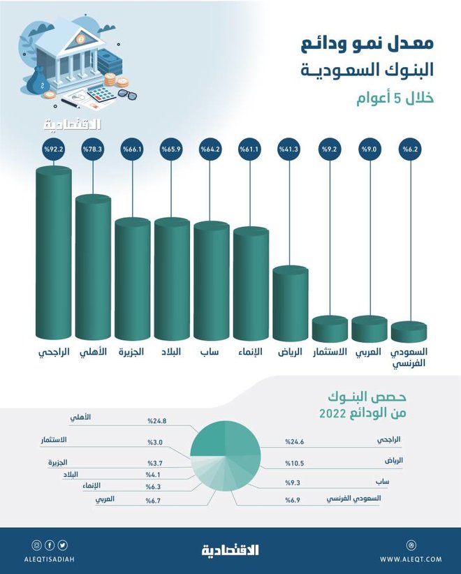 ارتفعت ودائع المصارف السعودية المدرجة البالغ عددها عشرة بنوك إلى نحو 2.29 تريليون ريال بنهاية العام الماضي، مقارنة بنحو 2.11 تريليون ريال في 2021، مسجلة بذلك، زيادة نسبتها 8.3 في المائة. ووفقا لرصد وحدة التقارير في صحيفة "الاقتصادية"، استند إلى القوائم المالية للمصارف السعودية، فإن معدل النمو هو الأدنى خلال أربعة أعوام، بعدما سجلت نموا بنحو 19.9 في المائة خلال 2021. استحوذ بنك الأهلي ومصرف الراجحي على نحو نصف ودائع البنوك السعودية وبواقع 49.4 في المائة، حيث نمت ودائع مصرف الراجحي 10 في المائة، في حين تراجعت ودائع البنك الأهلي 3 في المائة خلال العام الماضي. في المرتبة الثالثة من حيث حصص الودائع، جاء بنك الرياض بحصة 10.5 في المائة حيث سجلت ودائعة نموا بنحو 13 في المائة خلال العام الماضي، تلاه كل من البنك السعودي البريطاني 9.3 في المائة ثم البنك السعودي الفرنسي 6.9 في المائة. يعد بنكا السعودي للاستثمار والجزيرة من أقل البنوك السعودية حصصا في الودائع بواقع 3 و3.7 في المائة على الترتيب. ولجأت عديد من البنوك السعودية إلى إصدار صكوك لتعزيز سيولتها والاستفادة من الطلب المتزايد على التمويل خلال العام الماضي الذي نما بنحو 14.4 في المائة. خلال العام الماضي حققت البنوك السعودية نموا في صافي أرباحها بواقع 28.4 في المائة، لتصل إلى مستوى قياسي عند 62.6 مليار ريال، مستفيدة من نمو محافظ التمويل ودخل العمولات وكذلك تراجع بالمخصصات. الودائع خلال 5 أعوام خلال الأعوام الخمسة الماضية نمت الودائع في البنوك السعودية بنحو 57 في المائة، بمتوسط نمو سنوي بسيط وصل إلى 11.4 في المائة. وبلغت الودائع في البنوك السعودية خلال 2018 نحو 1.466 تريليون ريال، في حين زادت الودائع خلال الأعوام الخمسة بنحو 829.4 مليار ريال. ووفقا للرصد جاء مصرف الراجحي في قائمة أكثرالبنوك السعودية نموا بالودائع خلال خمسة أعوام وبواقع 92.2 في المائة، تلاه كل من البنك الأهلي 78.3 في المائة ثم بنك الجزيرة 66.1 في المائة. وزادت ودائع مصرف الراجحي خلال خمسة أعوام بواقع 271 مليار ريال، لتصل إلى 564.9 مليار ليعد ثاني أكبر بنك في السعودية من حيث الودائع، فيما زادت ودائع البنك الأهلي بنحو 249.6 مليار ريال خلال الفترة التي شملت استحواذه على بنك سامبا. النمو الكبير لودائع الأهلي والراجحي رفعت حصصهما من إجمالي ودائع البنوك السعودية من 21.7 و20 في المائة إلى 24.8 و24.6 في المائة على الترتيب. وبنك الجزيرة التي نمت ودائعه خلال الفترة 66.1 في المائة، رفعت حصة البنك من 3.5 في المائة إلى 3.7 في المائة. وتعد حصص البنك السعودي الفرنسي والبنك العربي الأكثر تراجعا خلال الأعوام الخمسة الماضية، حيث تراجعت حصة الفرنسي من 10.1 في المائة إلى 6.9 في المائة، في حين تراجعت حصة البنك العربي من 9.7 في المائة إلى 6.7 في المائة.