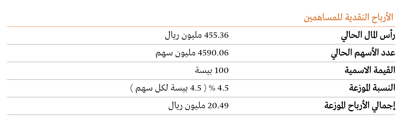 صادقت الجمعية العمومية لـ بنك صحار، المنعقدة بتاريخ 26 مارس 2023، على توزيع أرباح نقدية للمساهمين من رأس المال بنسبة 4.5 % (ما يعادل 4.5 بيسة لكل سهم) عن عام 2022، كما يوضح الجدول التالي: الأرباح النقدية للمساهمين رأس المال الحالي 455.36 مليون ريال عدد الأسهم الحالي 4590.06 مليون سهم القيمة الاسمية 100 بيسة النسبة الموزعة 4.5 % ( 4.5 بيسة لكل سهم ) إجمالي الأرباح الموزعة 20.49 مليون ريال
