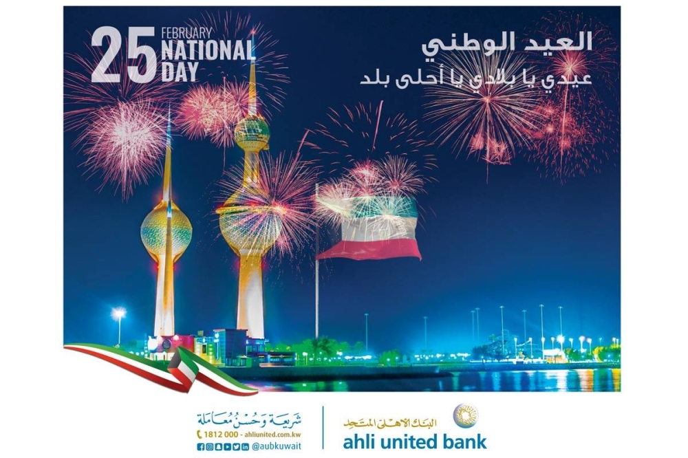 بمناسبة حلول اليوم الوطني للكويت وذكرى التحرير، يتقدم البنك الأهلي المتحد بأطيب التهاني والتبريكات إلى مقام صاحب السمو أمير البلاد الشيخ نواف الأحمد، وولي عهده الأمين سمو الشيخ مشعل الأحمد، وسمو رئيس مجلس الوزراء الشيخ أحمد نواف الأحمد، سائلا الله العلي القدير أن يحفظ الكويت وشعبها، وأن يعيد هذه المناسبة على الجميع بالخير واليمن والبركات. وقال البنك، في بيان صحافي، إنه سيغلق جميع فروعه يومي الأحد والاثنين 26 و27 فبراير الجاري، على أن تستأنف العمل يوم الثلاثاء 28 فبراير الجاري. في سياق متصل، أشار البنك إلى أنه يمكن للعملاء التواصل مع البنك عبر القنوات الإلكترونية، والتي تتضمن تطبيق البنك عبر الهاتف النقال، ومن خلال موقع البنك على شبكة الإنترنت www.ahliunited.com.kw، وحسابات البنك على مواقع التواصل الاجتماعي، وخدمة حياكم التي تعمل على مدار 24 ساعة يوميا على الرقم 1812000.