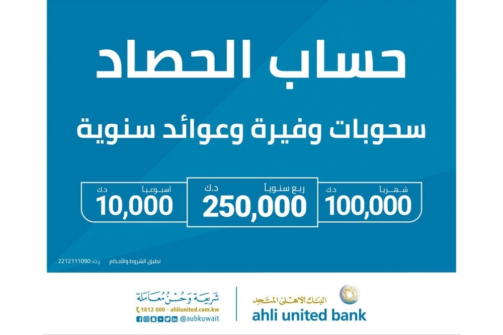 أعلن البنك الأهلي المتحد نتيجة السحب الأسبوعي على جوائز الحصاد، الذي أقيم اليوم، في المقر الرئيسي للبنك، بحضور ممثل عن وزارة التجارة والصناعة. وأسفر السحب عن حصول 10 من العملاء على 1000 دينار لكل منهم، وهم: عبدالعزيز موسى محمد الجمعة، وثريا محمد السيد عطية، وفاطمة حمد احمد العمار، وكفاية سليمان فهد الديحاني، وجابر محمد جابر الخشم، وعبدالمحسن سامر الزنكي، ومحمد عبدالعزيز مدني أحمد، ومصطفى أونيالوكال، وضيدان بن مفرح العنزي، وسارة راشد الطخيم. ويقدم حساب الحصاد الإسلامي في باقته الحالية مجموعة أوسع من المزايا، حيث يحظى الرابحون من عملاء «المتحد» بجائزة شهرية بقيمة 100000 د.ك، إضافة إلى 10 جوائز أسبوعية بقيمة 1000 دينار لكل جائزة، وتبقى الجوائز ربع السنوية الكبرى بقيمة 250000 د.ك نقدا للرابح هي أهم ما يطمح إليه العملاء، حيث تمثل لهم فرصة حقيقية لتحقيق حلم العمر، وفضلا عن هذه الباقة من الجوائز الجذابة هناك أيضا أرباح سنوية متوقعة على أساس عقد الوكالة، وهو ما يزيد من جاذبية حساب الحصاد الإسلامي.