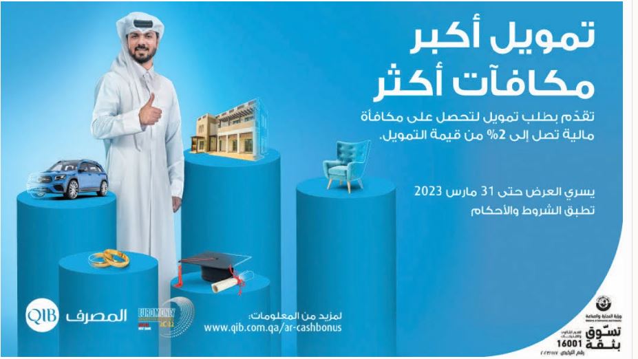 أعلنَ مصرف قطر الإسلامي (المصرف)، رائد الصيرفة الرقمية في قطر، عن إطلاق حملة تمويل مميزة لمنح مكافآت مالية لعملائه. تقدم الحملة مكافآت مالية تصل إلى 50,000 ريال قطري للعملاء الحاليين والجدد عند الاستفادة من التمويل الشخصي أو تمويل السيارات أو تمويل العقارات، وذلك تماشيًا مع التزام المصرف بمُكافأة عملائه. سيحصل العملاء المُحوّلة رواتبهم إلى المصرف، والمُتقدمون بطلب للحصول على تمويل، على مكافأة مالية بقيمة 1% من مبلغ التمويل. بينما يستفيد العملاء الجدد الذين يُحولون رواتبهم إلى المصرف خلال الحملة ويتقدمون بطلب للحصول على تمويل جديد من مكافأة مالية بقيمة 2% من مبلغ التمويل. وسيتم إضافة المكافأة المالية مباشرة إلى حساب مسك جديد. وسيحصل العملاء الجدد أيضًا على نقاط أبشر عند تحويل الراتب بالإضافة إلى اشتراك مجاني في تطبيق QIB-MyBook الذي يوفر عروض «اشترِ واحدًا واحصل على الثاني مجانًا» في أكثر من 1500 متجر وعروض حصرية في مختلف المطاعم والفنادق ومراكز الترفيه والصالونات ومراكز اللياقة البدنية وغيرها من المتاجر في قطر. وتشترط الحملة السارية حتى 31 مارس، أن يكون الحد الأدنى لطلب التمويل 100,000 ريال قطري، والذي يمكن أن يكون تمويلًا جديدًا أو إعادة تمويل لدى المصرف، وذلك لعملاء المصرف المؤهلين الذين تزيد رواتبهم على 10,000 ريال قطري.