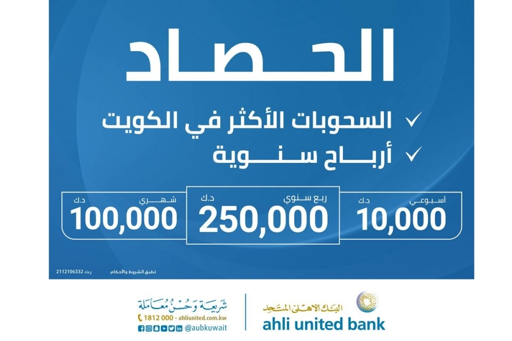 ضمن برنامج الحصاد الإسلامي، حساب السحب الأول على الجوائز الذي يقدمه البنك الأهلي المتحد، يقام (الأربعاء) السحب الشهري الذي يترقبه عملاء «الحصاد» لإعلان الرابح الذي سيفوز بالجائزة البالغة قيمتها 100.000 دينار، تحت إشراف وحضور ممثلي وزارة التجارة في المبنى الرئيسي ل«المتحد». وبهذه المناسبة، أفادت رئيس إدارة قنوات التوزيع البديلة ب «المتحد» هنادي خزعل: «ينفرد حساب الحصاد بمجموعة من المميزات الحصرية، حيث يُعد أبسط وأسهل برنامج ادخار، فضلاً عن ميزة فتح الحساب عبر الإنترنت بكل سهولة ويُسر مع ميزة الإيداع الفوري به». وأضافت خزعل: «هناك العديد من فرص الفوز الكبرى ما زالت بانتظار عملائنا الحاليين، وكل من يرغب بفتح (الحصاد) لدى (المتحد)». وتابعت: «يساهم برنامج جوائز الحصاد الإسلامي في تعزيز نشر ثقافة التوفير والتشجيع على الادخار بين أفراد المجتمع، كما يساهم في تغيير حياة عملائه إلى الأفضل، من خلال الفوز بالجوائز القيمة التي تساهم بإدخال السعادة في نفوسهم، ومن هذا المنطلق يحرص البنك على المراجعة الدورية لهيكل السحوبات، وتعديلها بما يتوافق مع متطلبات وطموحات عملاء البنك». جدير بالذكر، أن حساب الحصاد الإسلامي في باقته الحالية يقدم مجموعة أوسع من المزايا، حيث يحظى الرابحون من عملاء «المتحد» بجائزة شهرية بقيمة 100.000 دينار، إضافة إلى 10 جوائز أسبوعية بقيمة 1000 دينار لكل جائزة.