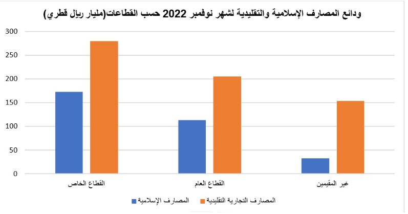ارتفعت أصول المصارف الإسلامية في دولة قطر خلال شهر نوفمبر 2022 بنسبة 9.2% سنوياً عند 542 مليار ريال، مع نموها شهرياً بـ1.1%. وحسب التقرير الشهري الصادر عن شركة بيت المشورة للاستشارات المالية في الأول من يناير 2023، فقد نمت أصول المصارف التجارية التقليدية بنسبة 0.8% شهرياً، مع نمو سنوي بـ0.3%. وقاد هذا النمو في موجودات البنوك الإسلامية لشهر نوفمبر الزيادة في رصيد الاحتياطيات بنسبة بلغت 23%. ولا تزال تشكل البنوك الإسلامية 29% من أصول القطاع المصرفي في دولة قطر. ورصد التقرير نمو الودائع لدى البنوك الإسلامية في شهر نوفمبر 2022 بنسبة بلغت 1.7% على أساس شهري لتبلغ 319 مليار ريال، وقاد هذا النمو الشهري الزيادة في ودائع القطاع الخاص بنسبة 3%. وارتفعت الودائع في البنوك الإسلامية على أساس سنوي بنسبة 2.4%، في حين انخفضت ودائع البنوك التقليدية هامشيًا بنسبة 0.2% على أساس شهري مع انخفاض سنوي بنسبة 2%. وانخفضت تمويلات البنوك الإسلامية هامشيًا بنسبة 0.4% مقارنة بالشهر السابق إذ بلغت في شهر نوفمبر 374 مليار ريال، وقد برز هذا الانخفاض في التمويلات الخارجية بنسبة 5%، وفي تمويلات القطاع العام بنسبة 4%. وفي البنوك التجارية التقليدية ارتفعت التمويلات في شهر نوفمبر هامشيًا بنسبة 0.6%. وعلى أساس سنوي نمت تمويلات البنوك الإسلامية بنسبة بلغت 10.3% في حين انخفضت في البنوك التجارية التقليدية 3%. وأوضح التقرير الشهري أن ودائع البنوك الإسلامية تركزت في شهر نوفمبر 2022 على القطاع الخاص بنسبة 54%، ثم القطاع العام بنسبة 36%، وكانت نسبة ودائع غير المقيمين 10%، في حين كانت هيكلة الودائع في البنوك التقليدية بنسبة 44% للقطاع الخاص، و32% للقطاع العام، و24% ودائع غير المقيمين. ويلاحظ تركز ودائع القطاع الخاص بشكل أكبر في البنوك الإسلامية، وتضاؤل ودائع غير المقيمين مقارنة بنظيرتها التقليدية. وتوجهت تمويلات البنوك الإسلامية في نوفمبر بشكل أكبر نحو القطاع الاستهلاكي بنسبة 28%، والقطاع العام بنسبة 20%، ثم قطاع العقارات بنسبة 19%، والخدمات 15% والتجارة 7%، في حين كانت التمويلات الخارجية الممنوحة في حدود 4%. ومقارنةً بالبنوك التجارية التقليدية فقد توجهت تمويلاتها نحو القطاع العام بنسبة 33%، ثم قطاع الخدمات بنسبة 21%، والتجارة بنسبة 16%، وكانت التمويلات الخارجية بنسبة 6%.