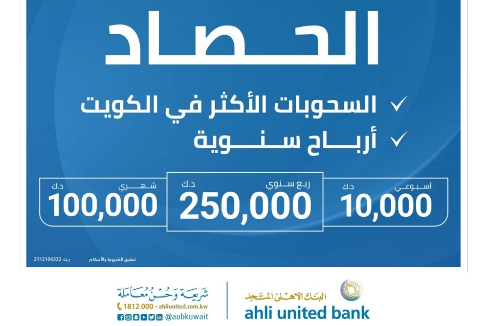 ضمن برنامج الحصاد الإسلامي، حساب السحب الأول على الجوائز الذي يقدمه البنك الأهلي المتحد، يجري البنك السحب ربع السنوي الذي يترقبه عملاء «الحصاد» لإعلان الرابح سعيد الحظ، الذي سيفوز بالجائزة الكبرى، البالغة قيمتها 250.000 دينار، في الرابع من يناير الجاري، تحت إشراف وحضور ممثلي وزارة التجارة. وبهذه المناسبة، أفادت هنادي خزعل، رئيس إدارة قنوات التوزيع المصرفية للأفراد بـ «المتحد»: «ينفرد حساب الحصاد بمجموعة من المميزات الحصرية، حيث يُعد أبسط وأسهل برنامج ادخار، فضلاً عن ميزة فتح الحساب عبر الإنترنت بكل سهولة ويُسر مع ميزة الإيداع الفوري في الحساب». وأضافت خزعل: «هناك العديد من فرص الفوز الكبرى ما زالت بانتظار عملائنا الحاليين، وكل من يرغب بفتح حساب الحصاد لدى (المتحد) ». وتابعت: «يساهم برنامج جوائز الحصاد في تعزيز نشر ثقافة التوفير، والتشجيع على الادخار بين أفراد المجتمع، كما يساهم في تغيير حياة عملائه إلى الأفضل، من خلال الفوز بالجوائز القيّمة التي تساهم في إدخال السعادة في نفوسهم، ومن هذا المنطلق يحرص البنك على المراجعة الدورية لهيكل السحوبات، وتعديلها بما يتوافق مع متطلبات وطموحات عملاء البنك». يقدم حساب الحصاد في باقته الجديدة مجموعة أوسع من المزايا، حيث يحظى الرابحون من عملاء «المتحد» بجائزة شهرية بقيمة 100.000 دينار، إضافة إلى 10 جوائز أسبوعية بقيمة 1000 دينار لكل جائزة. وتبقى الجوائز ربع السنوية الكبرى بقيمة 250.000 دينار نقداً للرابح هي أهم ما يطمح إليه العملاء، حيث تمثل لهم فرصة حقيقية لتحقيق حلم العُمر. وفضلاً عن هذه الباقة من الجوائز الجذابة، هناك أيضاً أرباح سنوية متوقعة على أساس عقد الوكالة، وهو ما يزيد من جاذبية حساب الحصاد. يُشار إلى أن الحد الأدنى للمشاركة والاستفادة من السحوبات كافة هي 100 دينار، تؤهل العميل للحصول على فرصتين لدخول السحب، والتي تزيد حتى 30.000 فرصة في السحب، إضافة إلى الحصول على أرباح سنوية مثمرة. وتتيح كل 50 ديناراً في حساب العميل فرصة واحدة للمشاركة في السحب، بشرط أن يحافظ على رصيده مدة خمسة عشر يوماً على الأقل قبل تاريخ السحب، وكلما زادت مدة الاحتفاظ تزيد فرص دخول السحب لكل 50 ديناراً. ويتم إجراء السحوبات كل يوم أربعاء بناءً على خطة السحب.