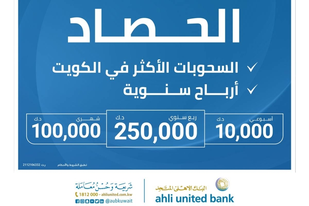 أجرى البنك الأهلي المتحد، السحب الأسبوعي على جوائز الحصاد الإسلامي، حساب السحب على الجوائز الإسلامي الأول في الكويت، والذي ينفرد بالعديد من المميزات، منها أنه أبسط وأسهل برنامج ادخار، فضلا عن ميزة فتح الحساب عبر الإنترنت بكل سهولة ويسر مع ميزة الإيداع الفوري في الحساب. وأسفر السحب عن حصول 10 من العملاء على 1000 دينار لكل منهم وهم: منصور هاشم بشير العتيقي، وحامد عبدالأمير جاسم القطان، وأحمد صالح محمد بوعركي، وتالا نور الدين بورقعة، وظوية عبد حسين، ونجيبة فاضل يوسف الباذر، وحنان صبحي شقيف، وخالد سالم السالم، وعذاري خليل إبراهيم الكندري، وشيخة عبدالعزيز يوسف المزيني. ويقدم حساب الحصاد الإسلامي في باقته الجديدة مجموعة أوسع من المزايا، حيث يحظى الرابحون من عملاء «المتحد» بجائزة شهرية بقيمة 100000 د.ك، إضافة إلى 10 جوائز أسبوعية بقيمة 1000 دينار لكل جائزة، وتبقى الجوائز ربع السنوية الكبرى بقيمة 250000 د.ك. نقدا للرابح أهم ما يطمح إليه العملاء، حيث تمثل لهم فرصة حقيقية لتحقيق حلم العمر. وفضلا عن هذه الباقة من الجوائز الجذابة، هناك أيضا أرباح سنوية متوقعة على أساس عقد الوكالة، ما يزيد جاذبية حساب الحصاد الإسلامي. وينفرد حساب الحصاد بالعديد من المميزات، منها أنه أبسط وأسهل برنامج ادخار، فضلا عن ميزة فتح الحساب عبر الإنترنت بكل سهولة ويسر مع ميزة الإيداع الفوري في الحساب.
