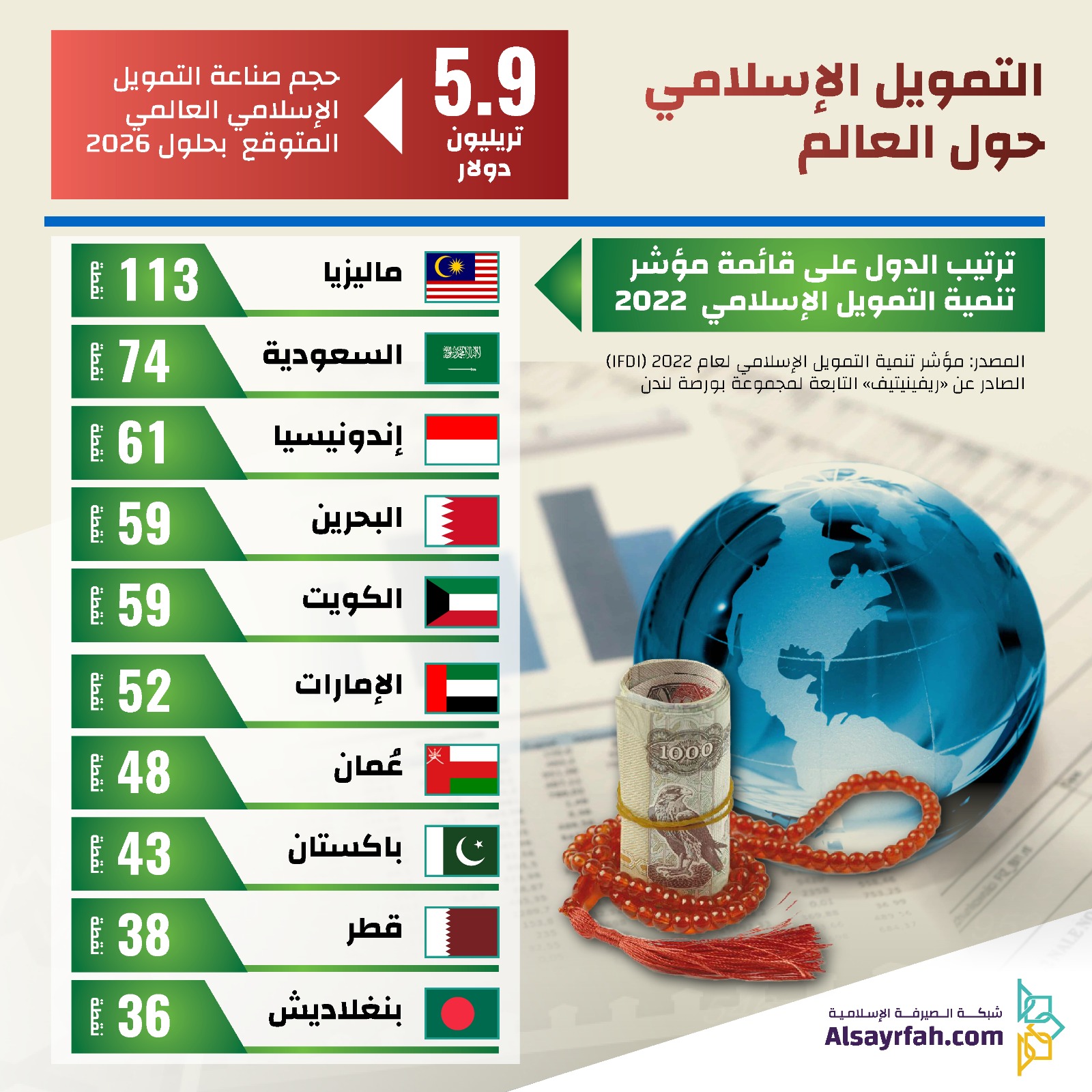 يتوقع أن يصل حجم صناعة التمويل الإسلامي العالمي إلى 5.9 تريليون دولار بحلول 2026 مقارنة مع 4 تريليونات في 2021، مدفوعة بالبنوك الإسلامية والصكوك وفقاً لمؤشر تنمية التمويل الإسلامي لعام 2022 (IFDI) الصادر عن«ريفينيتيف» التابعة لمجموعة بورصة لندن، والتي تعتبر من أبرز مزوّدي المعلومات الذكية للشركات والمختصين في العالم، والمؤسسة الإسلامية لتنمية القطاع الخاص. وتصدرت ماليزيا قائمة مؤشر تنمية التمويل الإسلامي هذا العام برصيد 113 نقطة، تلتها السعودية 74، ثم إندونيسيا 61، فالبحرين 59، والكويت 59، فالإمارات 52، ثم عُمان 48، وباكستان 43، وقطر 38 وبنغلاديش 36. ولفت التقرير المصاحب للمؤشر إلى أن دول الخليج سجلت أعلى متوسط درجات، بينما سجلت الولايات المتحدة ودول في أوروبا النقاط الأدنى. ويقيس مؤشر تنمية التمويل الإسلامي مدى تطور قطاع التمويل الإسلامي في 136 دولة بناء على الأداء المالي، والحوكمة، والاستدامة، والمعرفة، والوعي. وفي هذا الصدد، سجلت الكويت رصيد 42 في الأداء المالي واحتلت المرتبة الرابعة عالمياً والثانية خليجياً، و75 في الحوكمة لتحتل المرتبة الخامسة عالميا والثالثة خليجياً، و20 في الاستدامة، و21 في المعرفة، و157 في الوعي لتكون الثانية عالمياً والأولى على مستوى المنطقة. وبلغ حجم أصول قطاع التمويل الإسلامي في الكويت 153 مليار دولار في 2021، لتحتل البلاد المرتبة السادسة عالمياً والرابعة خليجياً، بينما بلغ حجم أصول قطاع التمويل الإسلامي في الخليج تريليوناً و617 مليوناً.