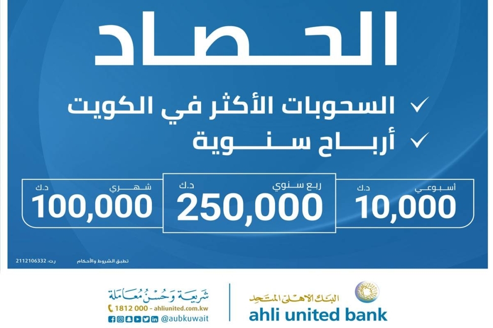 أجرى البنك الأهلي المتحد اليوم السحب الأسبوعي على جوائز الحصاد الإسلامي، حساب السحب على الجوائز الإسلامي الأول في الكويت، والذى ينفرد بالعديد من المميزات، ومنها أنه أبسط وأسهل برنامج ادخار، فضلا عن ميزة فتح الحساب عبر الإنترنت بكل سهولة ويسر مع ميزة الإيداع الفوري في الحساب . وأسفر السحب عن حصول 10 من العملاء على 1.000 دينار لكل منهم وهم: رقية محمد صالح المرشد، وإيمان علي إبراهيم السويلم، وعبدالرحمن حسين سرور، وخالد عبدالعزيز محمد فرج، وبدر عبدالرحمن ناصر العبودي، وحسن محمد حسين طالب، وفهد روضان غدنان روضان، ومحمد حسن بحبح خليل، وفاطمة حيدر عبدالله أشكناني، وفهد عويضه عبد الله العجمي.