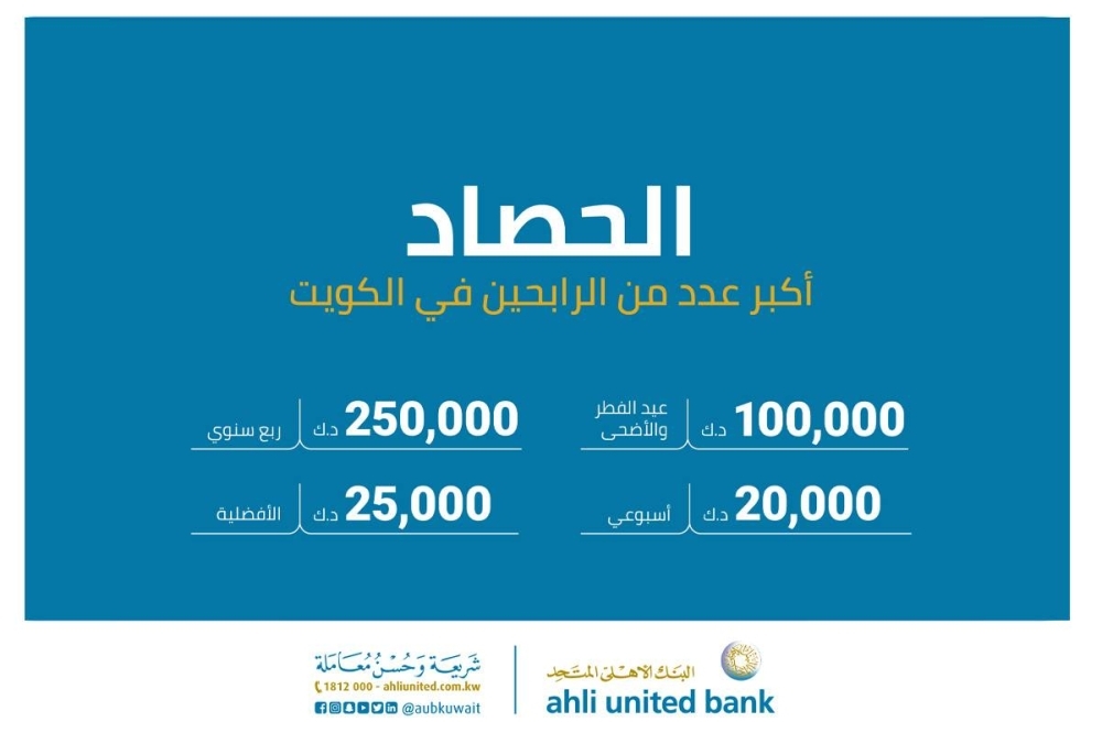 أجرى البنك الأهلي المتحد، السحب الأسبوعي على جوائز الحصاد الإسلامي، حساب السحب على الجوائز الإسلامي الأول في الكويت، والذي ينفرد بالعديد من المميزات، منها أنه أبسط وأسهل برنامج ادخار، فضلاً عن ميزة فتح الحساب عبر الإنترنت بكل سهولة ويُسر مع ميزة الإيداع الفوري في الحساب. وأسفر السحب عن حصول 10 من العملاء على 1000 دينار لكل منهم، وهم: عبدالعزيز محمد الشطي، وألطاف عبدالله الغانم، وعقاب جرى الرشيدي، ورجاء محمد البحيصي، وحسين جمال العمر، ونايف حجي العازمي، ومنيرة براك العازمي، وسميرة محمد مبارك، وماجد سلطان الشهاب، وراشد منور المطيري. يقدم حساب الحصاد في باقته الجديدة مجموعة أوسع من المزايا، حيث يحظى الرابحون من عملاء «المتحد» بجائزة شهرية بقيمة 100.000 دينار، إضافة إلى 10 جوائز أسبوعية بقيمة 1000 دينار لكل جائزة.