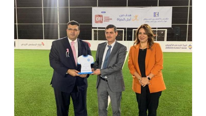 شارك البنك الإسلامي الأردني مؤسسة الحسين للسرطان في اطلاق مبادرة ( بطولة هدف من اجل الحياة) والتي تهدف الى تقديم التبرعات لتغطية تكاليف علاج مرضى السرطان، والتي تم اطلاقها في الرابع عشرمن شهر أكتوبر وتستمر حتى نهايته . واعرب الدكتور حسين سعيد الرئيس التنفيذي / المدير العام للبنك الاسلامي الاردني عن سعادته بمشاركة البنك في المساهمة بدعم مرضى السرطان من خلال تعزيز الشراكة المستدامة مع مؤسسة الحسين للسرطان بتنويع اساليب الدعم ( سواء من خلال المشاركة ببرنامج التسمية والتشريف او انشاء صندوق الجود لدعم المرضى المحتاجين وغيرها) والتي تأتي هذا العام من خلال مشاركة موظفي البنك الاسلامي الاردني في مباريات كرة قدم الودية مع فرق البنوك والشركات وتقديم التبرعات لعلاج مرضى مركز الحسين للسرطان. مؤكدا ان المشاركة تأتي تأكيداً لتحمل البنك الاسلامي الاردني لمسؤولياته الاجتماعية المستدامة في المجال الصحي وتدعم رسالة مكافحة مرض السرطان وتحقيق مبدأ التعاون التكافلي بين جميع ابناء المجتمع من خلال سعي البنك بتواجده ومشاركة موظفيه ضمن مختلف المبادرات التي تخدم المجتمع المحلي. وقد سلمت مادلين السلاق مديرة دائرة برامج جمع التبرعات في مؤسسة الحسين للسرطان درعاً تكريمياً للدكتور عبد الحميد ايو صقري مساعد المدير العام للبنك الاسلامي الاردني تقديراً لمشاركة ودعم البنك للمبادرة .
