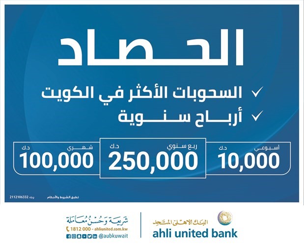 ضمن برنامج الحصاد الإسلامي، حساب السحب الأول على الجوائز الذي يقدمه البنك الأهلي المتحد ، يجري البنك في الثاني من نوفمبر المقبل، السحب الشهري الذي يترقبه عملاء الحصاد الإسلامي لإعلان الرابح سعيد الحظ الذي سيفوز بالجائزة البالغة قيمتها 100 ألف دينار، وذلك تحت إشراف وحضور ممثلي وزارة التجارة في المبنى الرئيسي للبنك الأهلي المتحد. وبهذه المناسبة، أفادت رئيس إدارة قنوات التوزيع البديلة بالبنك الأهلي المتحد هنادي خزعل: ينفرد حساب الحصاد الإسلام بمجموعة من المميزات الحصرية، حيث يعد أبسط وأسهل برنامج ادخار، فضلا عن ميزة فتح الحساب عبر الانترنت بكل سهولة ويسر مع ميزة الإيداع الفوري في الحساب. ويقدم حساب الحصاد الإسلامي في باقته الجديدة مجموعة أوسع من المزايا، حيث يحظى الرابحون من عملاء المتحد بجائزة شهرية بقيمة 100 ألف بالإضافة إلى 10 جوائز أسبوعية بقيمة 1000 دينار لكل جائزة، وتبقى الجوائز ربع السنوية الكبرى بقيمة 250 ألف نقدا للرابح هي أهم ما يطمح إليه العملاء، حيث تمثل لهم فرصة حقيقية لتحقيق حلم العمر. وفضلا عن هذه الباقة من الجوائز الجذابة. علما أن الحد الأدنى للمشاركة والاستفادة من السحوبات كافة هي 100 دينار، تؤهل العميل للحصول على فرصتين لدخول السحب والتي تزيد حتى 30000 فرصة في السحب، بالإضافة إلى الحصول على أرباح سنوية مثمرة.