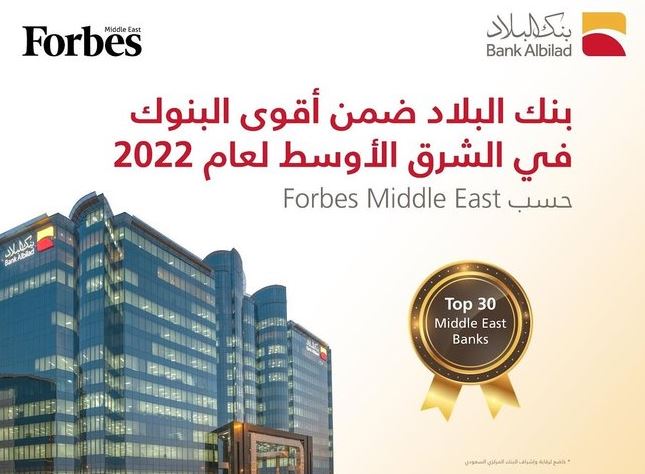أدرجت "فوربس الشرق الأوسط"، بنك البلاد ضمن قائمة فوربس 2022 لأقوى 30 بنك في الشرق الأوسط، بناء على قيمة الأصول والقيمة السوقية وصافي الأرباح والإيرادات. وضمت القائمة 30 بنك في المنطقة بينها 10 بنوك سعودية. وأوضح البنك، أن هذا الإنجاز يأتي نتيجة تطبيقه لمعايير متميزة في جودة الأصول، والحفاظ على مستويات الرسملة وتحقيق مركز سيولة قوي، بالإضافة إلى الخطة المتكاملة التي يعمل عليها نحو مستقبل مستدام للجميع. وقد تصدر قائمة الشركات الأعلى نموا بالسوق السعودية "تاسي" لفترة الـ 10 سنوات السابقة، في حين تجاوزت أرباحه حاجز المليار ريال خلال النصف الأول من 2022، بارتفاع قدره 24 % مقارنة بالنصف المماثل من 2021. يذكر أن "البلاد" يعد أحد أسرع البنوك السعودية نموا، ومن أبرز المصارف التي تمكنت من تخطي أزمة كورونا بحسب فوربس الشرق الأوسط، والحائز على جائزة أفضل جهة تمويلية في تجربة العميل من "سكني". كما حقق مؤخرا معدل 100 % في مؤشر البنك المركزي السعودي لجودة الردود على ملاحظات العملاء، في حين يحتل مركزا مرموقاً ضمن أكبر 30 بنك في الشرق الأوسط وفقا لقيمته السوقية.