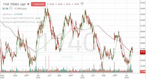 ثم دخل السهم في اتجاه عرضي بداية من شهر يوليو حتى أول شهر سبتمبر ونجح السعر في الخروج من النطاق العرضي في النصف الثاني من شهر سبتمبر حتى شهر أكتوبر، ولكن القوى الشرائية لم تكن كافية لمواصلة الاتجاه وبدأ السهم في التراجع من شهر نوفمبر حتى شهر ديسمبر ونجح السهم مؤخراً في شهر يناير من عام 2026 في الصعود مخترقاً مستويات مقاومة مهمة.