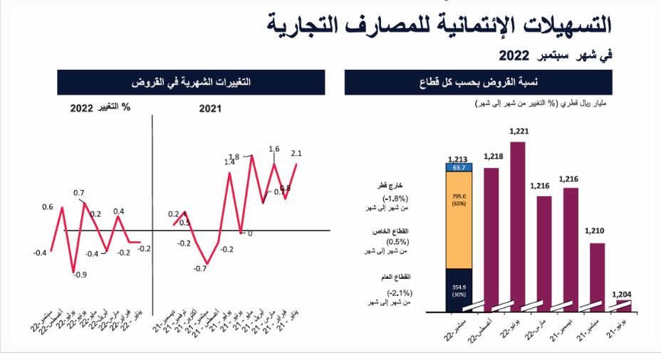 أظهر تقرير QNB ارتفاع إجمالي أصول القطاع المصرفي في قطر، بنسبة 0.4% في سبتمبر من عام 2022، مقارنةً بالشهر السابق (مسجلًا نسبة قدرها 0.4% في 2022) ليصل إلى 1.835 تريليون ريال قطري. وانخفض إجمالي محفظة قروض القطاع المصرفي في قطر بنسبة قدرها 0.4% مقارنةً بالشهر السابق (مسجلًا نسبة قدرها 0.2-% في 2022)، فيما انخفضت الودائع بنسبة 0.8 بالمئة مقارنةً بالشهر السابق (مسجلةً نسبة قدرها -0.9% في 2022). وقد دفع القطاع العام، بصفة أساسية، الائتمانات إلى الانخفاض (مسجلةً انخفاضًا نسبته 2.1% في سبتمبر مقارنةً بالشهر السابق). ومع انخفاض الودائع بنسبة 0.8% في سبتمبر، ارتفعت نسبة الودائع إلى القروض إلى ما نسبته 125.8% في الشهر نفسه مقابل 125.2% في أغسطس من عام 2022. ووَفقًا للتقرير فقد انخفض إجمالي محفظة القروض بنسبة 0.4%. فقد سجلت قروض القطاع العام المحلي انخفاضًا بنسبة قدرها 2.1% مقارنةً بالشهر السابق (مسجلةً نسبة قدرها -6.5% في 2022). ذلك أن القطاع الحكومي (الذي يمثل حوالي 31% من قروض القطاع العام) قد سجل انخفاضًا نسبته 6.8% مقارنةً بالشهر السابق (مسجلًا نسبة قدرها -23.7 في المئة 2022)، في حين سجل قطاع المؤسسات شبه الحكومية انخفاضًا بنسبة 7.6% مقارنة بالشهر السابق (مسجلًا نسبة قدرها 2.2% في 2022). وسجل قطاع قروض المؤسسات الحكومية (الذي يمثل حوالي 64% من قروض القطاع العام) ارتفاعًا بنسبة 0.8% مقارنةً بالشهر السابق (مسجلًا نسبة قدرها 3.9% في 2022). وارتفع إجمالي قروض القطاع الخاص بنسبة 0.5% مقارنةً بالشهر السابق (مسجلًا نسبة قدرها 3.7% في 2022). وقد ساهم قطاعا الخدمات والعقارات مساهمةً رئيسة في نمو قروض القطاع الخاص لشهر سبتمبر من عام 2022. فقد سجل قطاع الخدمات (الذي يساهم بنحو 29% من قروض القطاع الخاص) ارتفاعًا بلغت نسبته 0.7% مقارنةً بالشهر السابق (مسجلًا نسبة قدرها 5.4% في 2022). بالمثل، سجل قطاع العقارات (الذي يساهم بنحو 21% من قروض القطاع الخاص) ارتفاعًا بلغت نسبته 0.7% مقارنةً بالشهر السابق (مسجلًا نسبة قدرها 5.7% في 2022). وخلال شهر سبتمبرم، سجل قطاع التجارة العامة (الذي يساهم بحوالي 21% من قروض القطاع الخاص) ارتفاعًا نسبته 0.5% مقارنةً بالشهر السابق (مسجلًا نسبة قدرها 1.1% في 2022)، في حين انخفض قطاع الاستهلاك والأنشطة الأخرى (الذي يساهم بنحو 22% من قروض القطاع الخاص) انخفاضًا طفيفًا نسبته 0.01% مقارنةً بالشهر السابق (مسجلًا نسبة قدرها 4.5% في 2022). كذلك، خلال شهر سبتمبر من عام 2022، انخفضت القروض خارج قطر بنسبة قدرها 1.8% مقارنةً بالشهر السابق (مسجلةً نسبة قدرها -8.9 بالمئة في 2022). وانخفضت ودائع القطاع العام بنسبة 1.3% في شهر سبتمبر من عام 2022 مقارنةً بالشهر السابق (مسجلةً نسبة قدرها 12.5% في 2022)، ما أدى إلى انخفاض إجمالي في ودائع القطاع المصرفي في قطر. وبالنظر إلى تفاصيل القطاع، يُلاحظ أن القطاع الحكومي (الذي يمثل حوالي 27% من ودائع القطاع العام) قد سجل انخفاضًا نسبته 15.1% مقارنةً بالشهر السابق.
