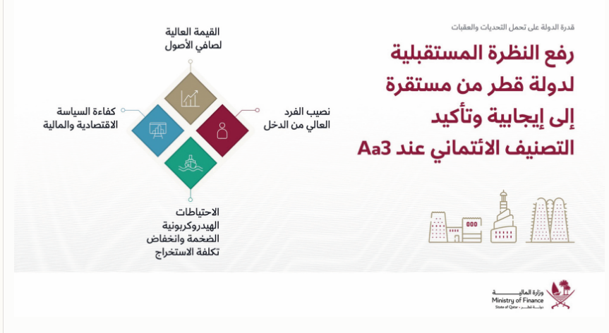 رفعت وكالة موديز للتصنيف الائتماني العالمية النظرة المستقبلية لدولة قطر من مستقرة إلى إيجابية فيما أكدت التصنيف الائتماني السيادي عند مستوى Aa3 مشيرة إلى أن الارتفاع القياسي لأسعار الطاقة ومونديال 2022 وتحسن البيئة التشغيلية كلها عوامل ستنعكس إيجابا على الموازنة العامة لقطر، والتي شهدت ارتفاعا بواقع 12 ضعفا خلال النصف الأول من 2022، وهي أحدث بيانات متاحة، ليصل الفائض إلى مستوى بلغ 47.3 مليار ريال مقارنة مع فائض بلغ مستوى 4 مليارات ريال خلال الفترة ذاتها من العام الماضي نتيجـة للسـيطرة الملحوظة علـى النفقـات وارتفـاع الإيـرادات وانتعاش أسعار النفط. وقالت موديز إن رفع النظرة المستقبلية إلى دولة قطر إلى درجة «إيجابية» يعكس بشكل كبير الفرص الواعدة لنمو الاقتصاد القطري وخصوصا أن التقديرات تشير إلى تحقيق فائض في الموازنة يوازي 9.5 % من الناتج المحلي الإجمالي خلال عام 2022 بناءً على افتراض متوسط سعري للنفط يبلغ 100 دولار للبرميل هذا العام. لافتة إلى أن هناك حزمة من العوامل تعزز الآفاق المستقبلية للاقتصاد القطري وهي: حصة الفرد المرتفعة من الناتج المحلي الإجمالي واحتياطيات الغاز الهائلة مع انخفاض تكلفة استخراجه والأصول السيادية المتراكمة للدولة من خلال جهاز قطر للاستثمار (صندوق الثروة السيادية) والذي يمتلك أيقونات استثمارية تتوزع في جميع قارات العالم فضلا عن فعالية الاقتصاد الكلي والسياسة الاقتصادية المحفزة للاستثمار. وعلى مستوى الآفاق طويلة الأجل تتوقع موديز أن يستفيد الأداء المالي لدولة قطر من خفض الإنفاق حيث تم الانتهاء حاليا من معظم مشاريع البنية التحتية الرئيسية المتعلقة بكأس العالم لكرة القدم 2022. فعلى مدى السنوات العشر الماضية، أنفقت الدولة حوالي 20 مليار دولار سنويًا لتطوير وتحديث البنية التحتية وبالتالي فإنه وخلال السنوات القادمة ستشهد قطر انخفاضا كبيرا في الإنفاق بعد انتهاء مونديال 2022 وبالتزامن مع ذلك فإن أسعار الطاقة والطلب على الغاز في مسار مرتفع مما يعزز توقعات النمو الاقتصادي القوي خلال السنوات الخمس المقبلة فضلا عن زيادة قدرة الدولة على لجم المخاطر الاقتصادية والمالية المحتملة. ونوهت موديز إلى أن مشروع توسعة حقل الشمال الذي تباشر قطر غاز تنفيذه بالنيابة عن قطر للطاقة سينعكس إيجابا على الإيرادات الحكومية على المدى الطويل مع تحقيق طفرة كبرى في إنتاج صادرات ومكثفات الغاز الطبيعي ويتكون حقل الشمال من مرحلتين «حتى الآن»، الأولى حقل الشمال الشرقي وتستهدف زيادة دولة قطر الإنتاجية من الغاز الطبيعي المسال من 77 مليون طن سنويا إلى 110 ملايين طن سنويا بحلول عام 2026، كما سينتج المشروع كميات كبيرة من المكثفات، وغاز البترول المسال، والإيثان، والكبريت، والهيليوم ليصل إجمالي الإنتاج 1.4 مليون برميل نفط مكافئ يوميا. أما المرحلة الثانية فتشمل زيادة إنتاج الغاز من القطاع الجنوبي لحقل الشمال والتي ستزيد الطاقة الإنتاجية للغاز من 110 ملايين طن سنويا إلى 126 مليون طن سنويا. ويتوقع بدء الإنتاج من مشروع القطاع الجنوبي (المرحلة الثانية) في عام 2027، حيث سيتضمن المشروع بناء خطي إنتاج عملاقين إضافيين (بسعة 8 ملايين طن سنويا لكل منهما)، بالإضافة إلى المرافق البحرية والبرية المرتبطة بهما. حتوي مشروع توسعة حقل الشمال على منظومة لاسترجاع الغاز المتبخر أثناء الشحن، وهو ما سيقلل من انبعاثات غازات الاحتباس الحراري بما يقارب مليون طن مكافئ سنوياً من غاز ثاني أكسيد الكربون، كما سيعمل المشروع على توفير 10.7 مليون متر مكعب من المياه سنويا من خلال تدوير وإعادة استعمال 75 % من مياه الصرف الصناعي، وكذلك سيتم تقليل انبعاثات أكاسيد النيتروجين بنسبة 40 % من خلال تطبيق تقنية Dry Low NOx المحسنة. ومن المقرر توفير جزء كبير من احتياجات المشروع من الطاقة الكهربائية من شبكة الكهرباء الوطنية في قطر، وبالتحديد من مشروع محطة الخرسعة للطاقة الشمسية التي تبلغ طاقتها الإنتاجية 800 ميجاواط، بالإضافة إلى حوالي 